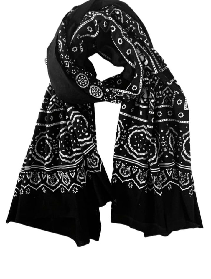 The scarf features intricate, repeating geometric and floral/circular motifs that are characteristic of revered South Asian textile traditions. The bold, decorative borders provide a beautiful contrast, framing the overall look. The black base with crisp white printing ensures high visibility and a timeless, sophisticated aesthetic.